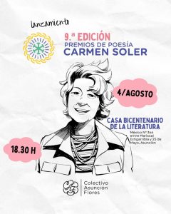 El Colectivo Asunción Flores (CAF) invita al lanzamiento y apertura de la 9.° edición de los Premios de Poesía Carmen Soler este lunes 04 de agosto  de 2025 desde las 18.30 en la Casa Bicentenario de la Literatura (México Nº 346 entre Mariscal Estigarribia y 25 de Mayo, Asunción). Acceso libre y gratuito.